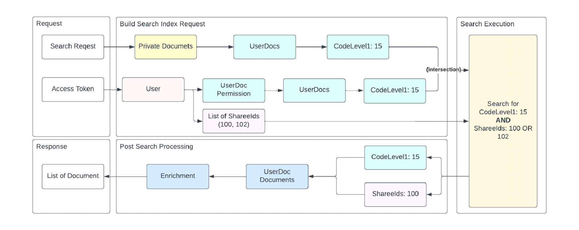 For UserDoc documents, on top of Basic entitlement model based on Document permissions, the system checks for shareeIds property when Search sub-system executes search request. There are no additional checks during post search processing. However, the Document Viewer in the platform double checks entitlements with our entitlement system.